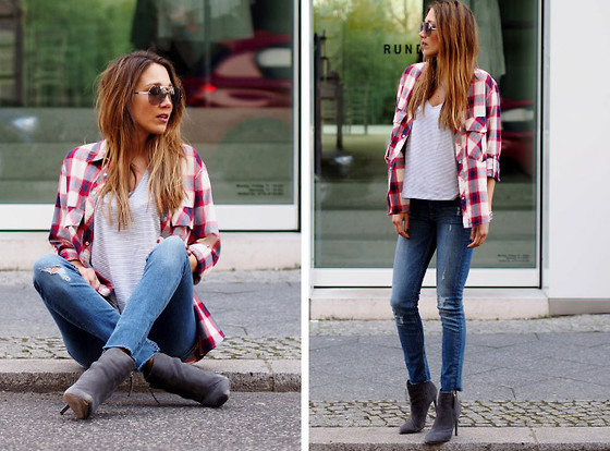 easy fall everyday outfit ideas 6Here’s a cool and laidback weekend look – plaid shirt, white shirt, denim jeans and suede boots.